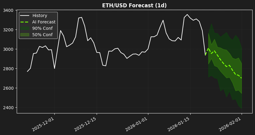 Zodiac AIによる01月21日のNAVIGATORランク分析結果をお伝えします。ETH/USDは$2,936で取引を終え、トレンドは「DOWN」です。前日予測値($3,010)に対し、実際の終値は乖離(-2.45%)を示しましたが、これは安定性維持のための仕様として想定内の動きです。主要ニュース(悪材料)の影響、上値抵抗線での反落、および直近の急落トレンド継続を踏まえ、次のターゲットを$3,010、最終ターゲットを$2,700と設定します。Oracleモデルなら 主要ニュース(悪材料)の影響 / 上値抵抗線(レジスタンス)での反落 / 直近の急落トレンド継続 等を解析済です。 本情報は投資助言ではありません。投資判断はご自身の責任において行ってください。