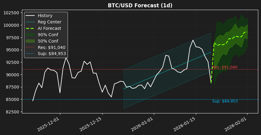 Zodiac AIによる01月21日のORACLEランク分析結果をお伝えします。前回の分析において、市場急落により乖離は-8114 (-8.42%)となりましたが、これは市場の急激な変動に対し、将来的な安定性維持のための理論目標値を提示し続けた結果です。Zodiac AIは常に変動を織り込みながら理論的な目標値を提示することに成功しています。現在のBTC/USD価格は $88,310 です。トレンドはUPを維持しており、次の理論目標値は $96,425、最終理論目標値は $98,581 と設定されています。この予測は、ORACLEランクの深層解析に基づき、トレンドチャネル下限(-2σ)からの反発 / 主要ニュース(悪材料)の影響 を主要因としています。この数値は理論上の予測値であり、投資アドバイスではありません。