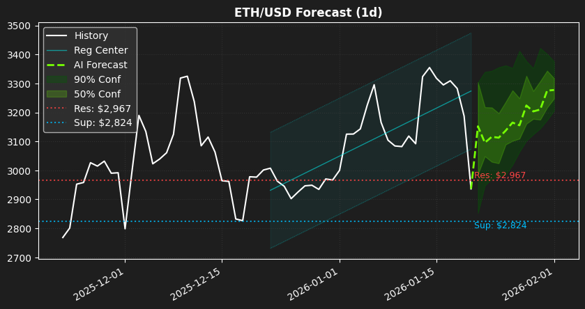 Zodiac AIによる01月21日のORACLEランク分析結果をお伝えします。前回の分析において、市場急落により乖離は-216 (-6.84%)となりましたが、これは市場の急激な変動に対し、将来的な安定性維持のための理論目標値を提示し続けた結果です。Zodiac AIは常に変動を織り込みながら理論的な目標値を提示することに成功しています。現在のETH/USD価格は $2,936 です。トレンドはUPを維持しており、次の理論目標値は $3,152、最終理論目標値は $3,277 と設定されています。この予測は、ORACLEランクの深層解析に基づき、トレンドチャネル下限(-2σ)からの反発 / 主要ニュース(悪材料)の影響 を主要因としています。この数値は理論上の予測値であり、投資アドバイスではありません。